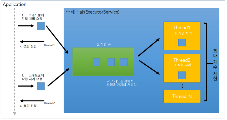스레드풀(Thread Pool)은 말 그대로 스레드들을 담는 공간을 의미합니다. 즉, 스레드풀이라는 공간에 일정량의 스레드를 배치해 두는 것이죠. 그리고 어떤 작업이 스레드를 필요로 하면 스레드 풀에서 가져다 쓰면 됩니다. 그리고 만일 작업량이 많아 스레드 풀에 스레드가 비어있다면 누군가가 스레드를 스레드 풀에 반납하길 기다렸다가 스레드가 반납되면 그 스레드로 작업을 하는 것입니다.