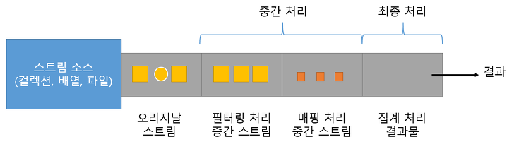 스트림 구조 즉, 중간처리에서는 원하는 데이터를 얻을 수 있도록 처리하는 작업을 하고, 최종처리에서는 얻은 데이터를 가공하는 역할을 한다.