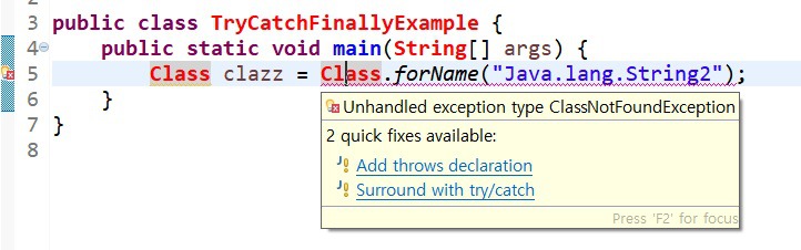 public class ThrowsExample { public static void main(String[] args) { try { findClass(); } catch (ClassNotFoundException e) { System.out.println("클래스가 존재하지 않습니다."); } } public static void findClass() throws ClassNotFoundException { Class clazz = Class.forName("java.lang.String2"); } }
