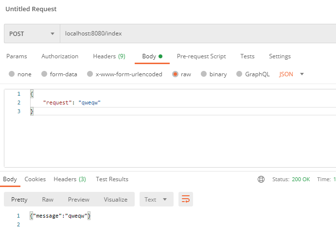 package main import ( "encoding/json" "fmt" "io/ioutil" "net/http" ) type indexResponse struct { Message string `json:"message"` } type indexRequest struct { Request string } func main() { port := 8080 http.HandleFunc("/index", indexHandler) http.ListenAndServe(fmt.Sprintf(":%v", port), nil) } func indexHandler(resp http.ResponseWriter, req *http.Request) { body, err := ioutil.ReadAll(req.Body) if err != nil { http.Error(resp, "Bad request(body)", http.StatusBadRequest) return } var request indexRequest err = json.Unmarshal(body, &request) if err != nil { http.Error(resp, "Bad request(json unmarshal)", http.StatusBadRequest) return } response := indexResponse{Message: request.Request} encoder := json.NewEncoder(resp) encoder.Encode(response) }실행결과)