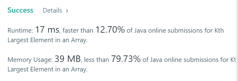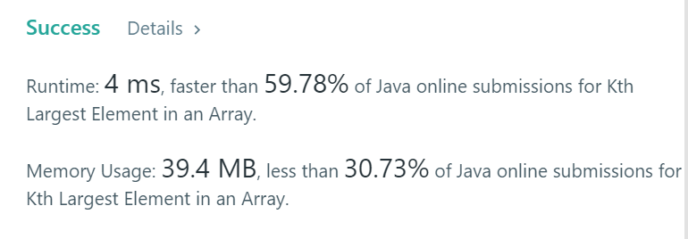 public int findKthLargest(int[] nums, int k) { final PriorityQueue<Integer> pq = new PriorityQueue<>(); for(int v : nums) { pq.offer(v); if(pq.size() > k) { pq.poll(); } } return pq.peek(); }더보기1. 설명