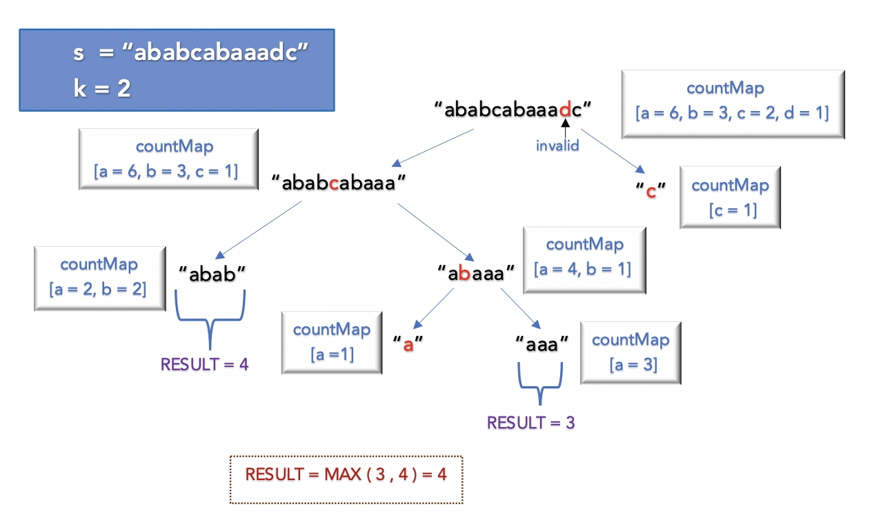 public int longestSubstring(String s, int k) { return longestSubstringUtil(s, 0, s.length(), k); } int longestSubstringUtil(String s, int start, int end, int k) { if (end < k) return 0; int[] countMap = new int[26]; // update the countMap with the count of each character for (int i = start; i < end; i++) countMap[s.charAt(i) - 'a']++; for (int mid = start; mid < end; mid++) { if (countMap[s.charAt(mid) - 'a'] >= k) continue; int midNext = mid + 1; while (midNext < end && countMap[s.charAt(midNext) - 'a'] < k) midNext++; return Math.max(longestSubstringUtil(s, start, mid, k), longestSubstringUtil(s, midNext, end, k)); } return (end - start); }