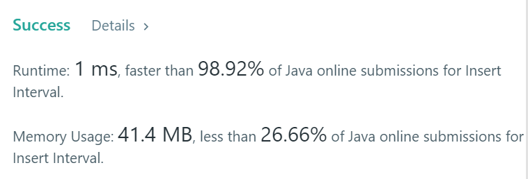 - 주어진 interval 배열은 이미 정렬되어있으므로, 상관관계가 있는 interval들을 하나로 합쳐서 리스트로 던지면 됨.
